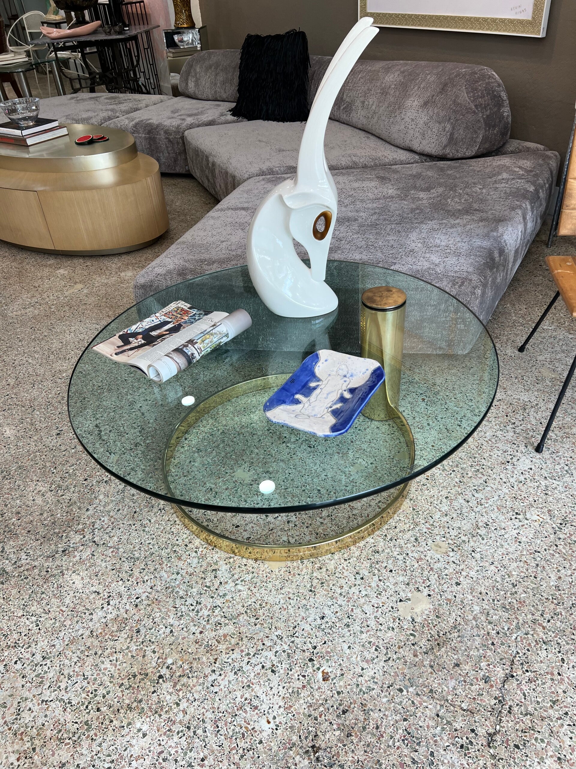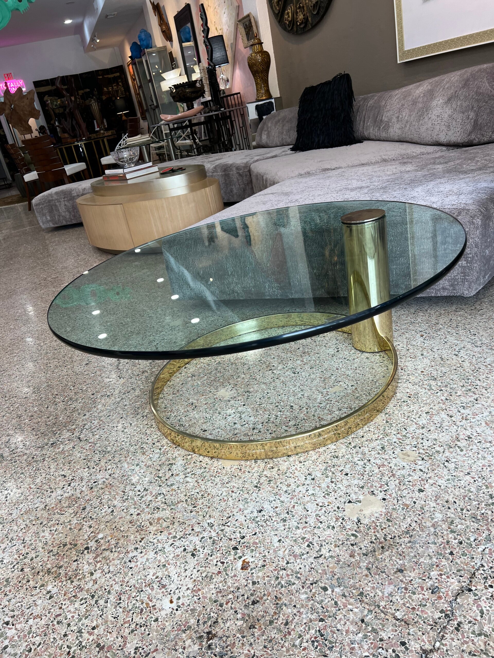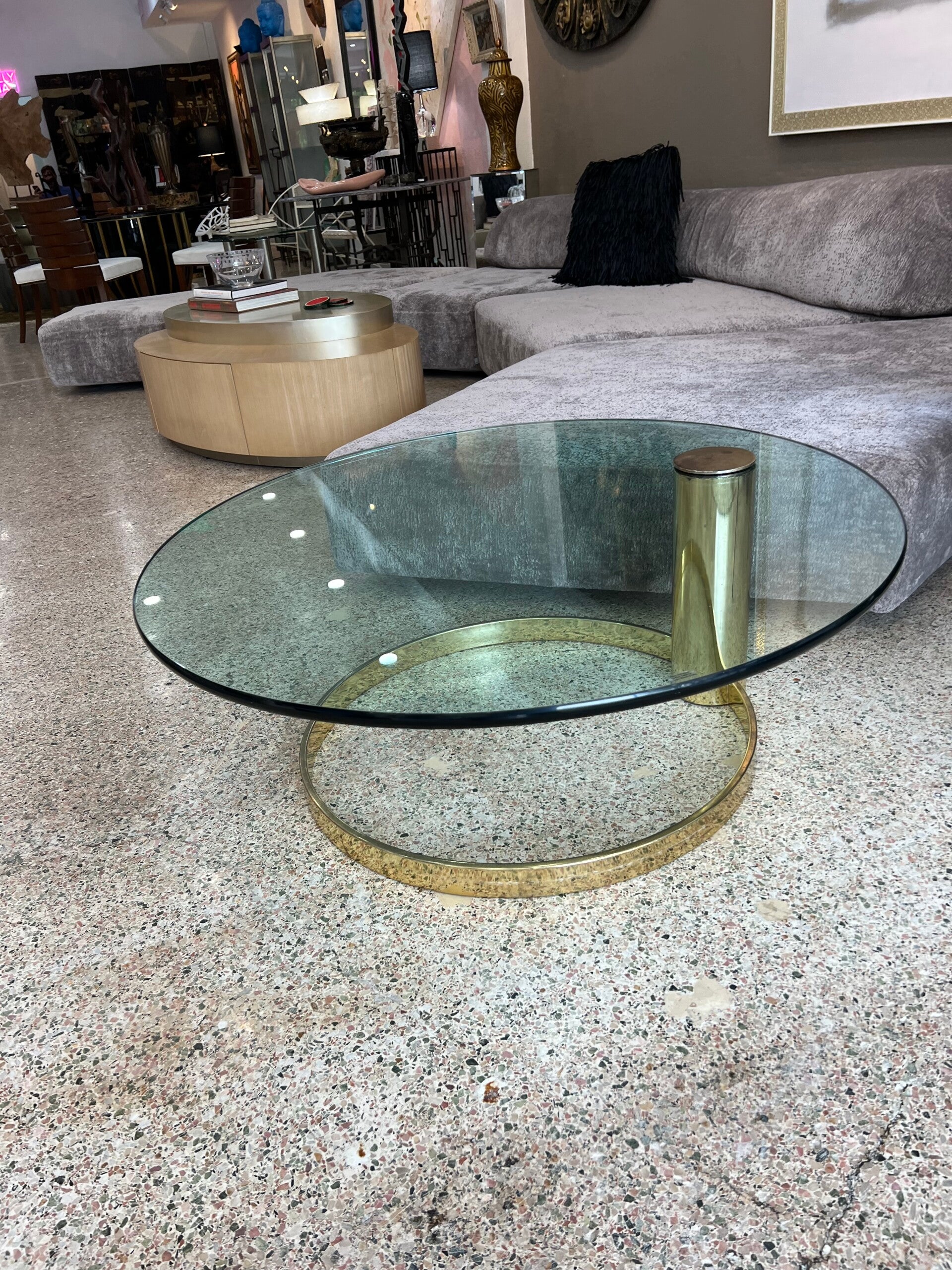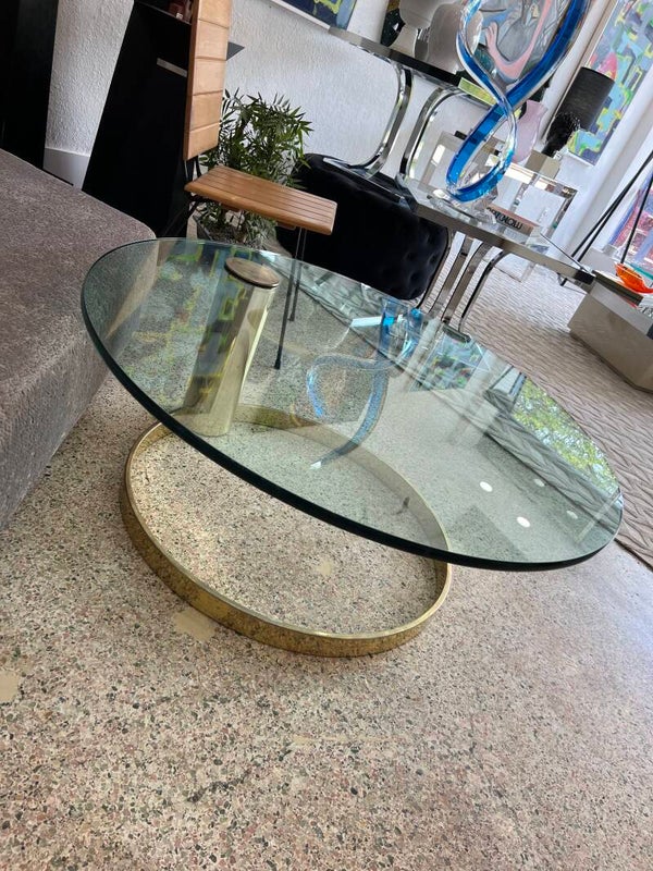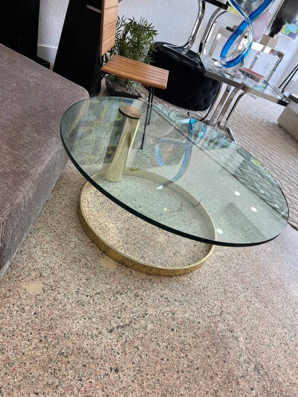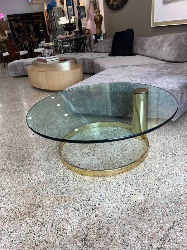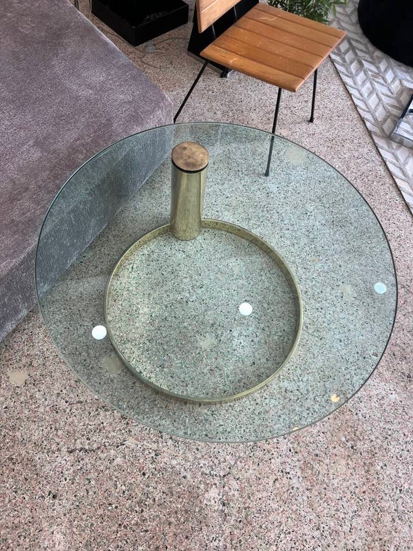 Elevate your space with this stunning vintage-modern coffee table! Featuring a brass-plated cantilever base, a thick glass top, and an iconic mid-century design by Leon Rosen for Pace Collection, this circular piece adds a touch of elegance and sophistication to any home or business interior. Perfect for those who appreciate timeless style with a modern twist. Make a statement with this versatile and chic centerpiece!